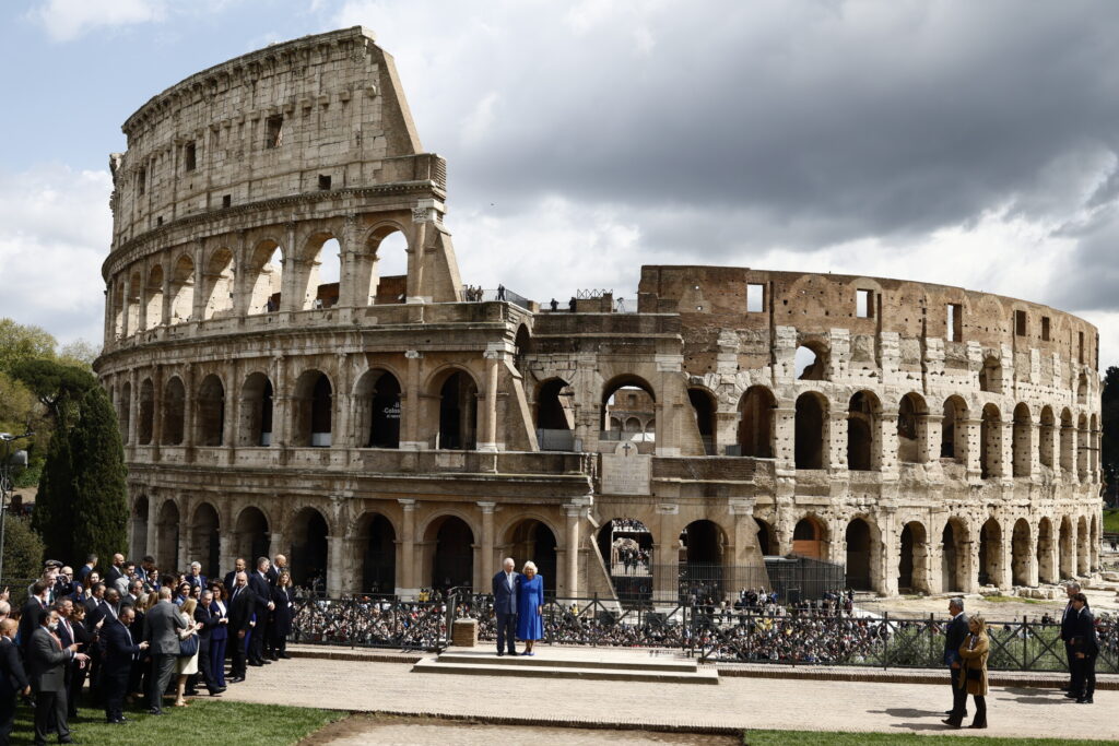 Rome, April 8 (LaPresse) – King Charles and Queen Camilla climbed onto the viewing terrace at the edge of the Temple of Venus in the Colosseum Archaeological Park for a souvenir photo with the Flavian Amphitheatre behind them. The British royals greeted the crowd gathered in the area of the monument's entrance.